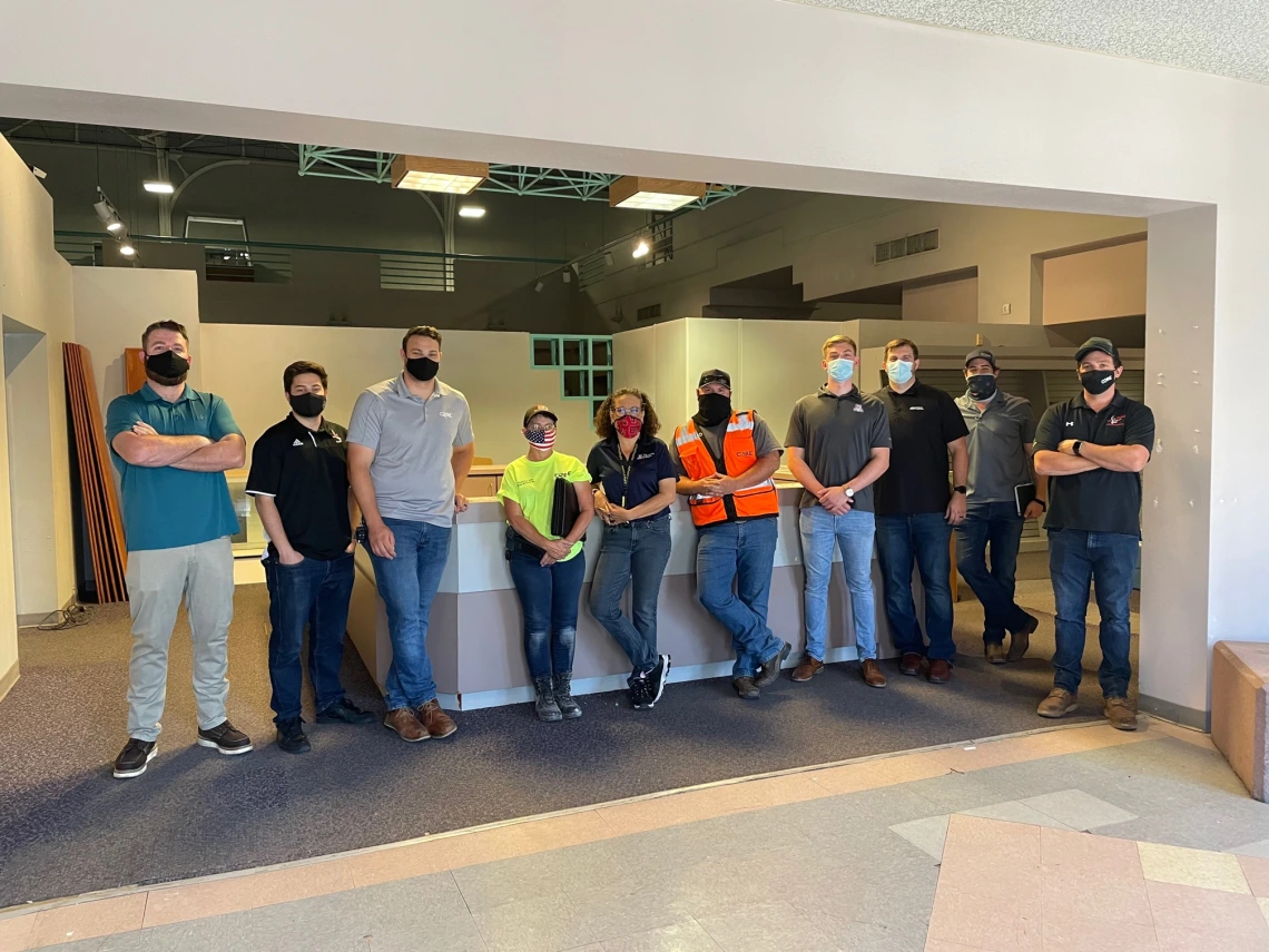 Contractors, subs and UA campus operations personnel in the front lobby area.